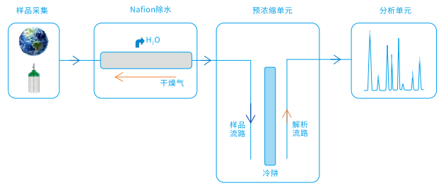 樣氣采集單元:主要由標(biāo)準(zhǔn)化的大氣采樣總管、伴熱惰性化管路、流量控制、除塵等組成,實(shí)現(xiàn)樣氣的無損傳輸。