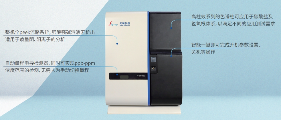 TIC-680離子色譜儀是天瑞儀器在TIC-600的基礎(chǔ)上,推出的全新一款具有雙極電路、電磁閥進樣、可搭載自動淋洗液發(fā)生器、同時可兼容安培檢測器、紫外檢測器等,滿足不同的樣品測試需求。該款產(chǎn)品搭載淋洗液自動發(fā)生器可實現(xiàn)梯度洗脫,滿足新國標GB5750.10-2023生活飲用水中消毒副產(chǎn)物的測定;除此之外該產(chǎn)品既能滿足常規(guī)陰離子、陽離子、氰根及小分子有機酸的分析,也能與AFS、ICP、ICP-MS聯(lián)用進行形態(tài)分析;普遍適用于環(huán)境、疾控、食品、電子、化工、醫(yī)藥、礦冶等領(lǐng)域。
