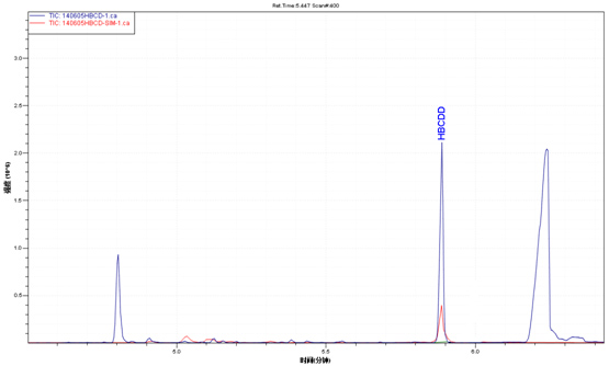 樣品TIC圖(藍色)與六溴環(huán)十二烷標準品TIC圖(紅色)