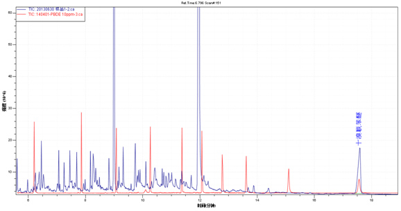 樣品TIC圖(藍色)與多溴聯(lián)苯醚混標TIC圖(紅色)