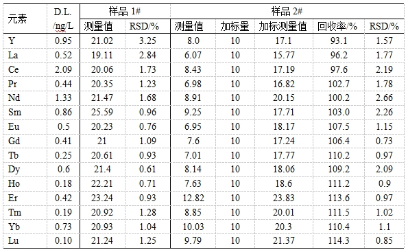 油田稀土示蹤劑主要用來考察油田井間的導(dǎo)通性,具有無放射性、安全穩(wěn)定、用量少、分析精度高等特點(diǎn)。將所得油田水樣搖勻過濾,稀硝酸稀釋一定倍數(shù),以內(nèi)標(biāo)法校正樣品基體對(duì)待測(cè)同位素影響,考察Y、La、Ce等15種稀土示蹤劑的檢出限、精密度(以RSD表示)、加標(biāo)回收率。發(fā)現(xiàn)檢出限為0.10~2.09ng/L;樣品1#的精密度為0.61%~3.25%;樣品2#中各元素加標(biāo)回收率為93.1%~114.3%,精密度為0.85%~2.66%。