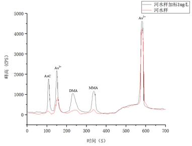 河水樣品及加標(biāo)1μg/L的測(cè)試結(jié)果詳見表4,樣品及加標(biāo)后砷形態(tài)疊加譜圖如圖5所示。