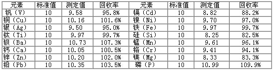 采用本方法測試潤滑油金屬含量光譜分析標(biāo)準(zhǔn)物質(zhì)GBW(E)130129、GBW(E)130132,對比實(shí)際測定值與標(biāo)準(zhǔn)值,得出實(shí)際測試的回收率,得到準(zhǔn)確度數(shù)據(jù),結(jié)果見下表