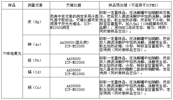 天瑞儀器參考《中華人民共和國(guó)藥典》,采用原子吸收光譜儀(AAS6000;AAS8000)、原子熒光光譜儀(AFS200系列)、電感耦合等離子體質(zhì)譜儀(ICP-MS2000),對(duì)六味地黃丸中鎘、鉛、銅、砷、砷、汞等重金屬的測(cè)定進(jìn)行研究,測(cè)試結(jié)果準(zhǔn)確度高,重復(fù)性好。