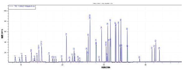 1. 二氯二氟甲烷;2. 氯甲烷;3. 氯乙烯;4. 溴甲烷;5. 氯乙烷;6. 三氯氟甲烷;7. 1,1-二氯乙烯;8. 二氯甲烷;9. 反-1,2-二氯乙烯;10. 1,1-二氯乙烷;11. 2,2-二氯丙烷;12. 順-1,2-二氯乙烯;13. 溴氯甲烷;14. 氯仿;15. 1,1,1-三氯乙烷;16. 四氯化碳;17. 1,1-二氯丙烯;18. 1,2-二氯乙烷;19. 氟苯(內(nèi)標(biāo)物1);20. 三氯乙烯;21. 1,2-二氯丙烷;22. 二溴甲烷;23. 一溴二氯甲烷;24. 順-1,3-二氯丙烯;25. 反-1,3-二氯丙烯;26. 1,1,2-三氯乙烷;27. 四氯乙烯;28. 1,3-二氯丙烷;29. 二溴一氯甲烷;30. 1,2-二溴乙烷;31. 1,1,1,2-四氯乙烷;32. 溴仿;33. 4-溴氟苯(內(nèi)標(biāo)2);34. 1,1,2,2-四氯乙烷;35. 1,2,3-三氯丙烷;36. 1,2-二氯苯-d4(替代物);37. 1,2-二溴-3-氯丙烷;38. 六氯丁二烯