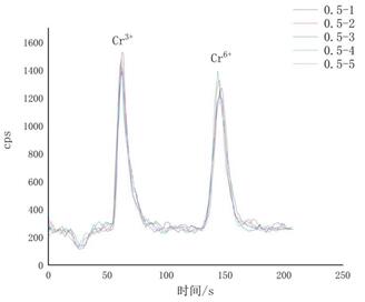 多次進(jìn)樣測(cè)定濃度為0.5 μg/L Cr3+和Cr6+混合標(biāo)準(zhǔn)溶液,進(jìn)行重復(fù)性試驗(yàn),見(jiàn)圖3: