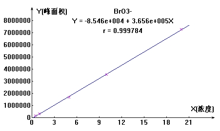 按照溴酸根各濃度點依次進樣,計算其峰面積,以濃度和峰面積繪制標準曲線,線性相關(guān)系數(shù)為0.9997,結(jié)果詳見圖2。