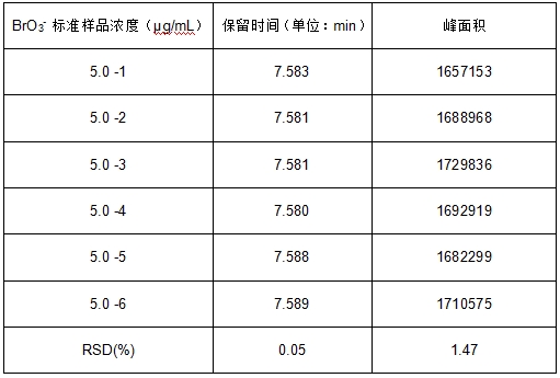取5.0μg/mL溴酸根標準溶液重復(fù)進樣6次,考察保留時間和峰面積的重現(xiàn)性,重現(xiàn)性結(jié)果詳見表3。